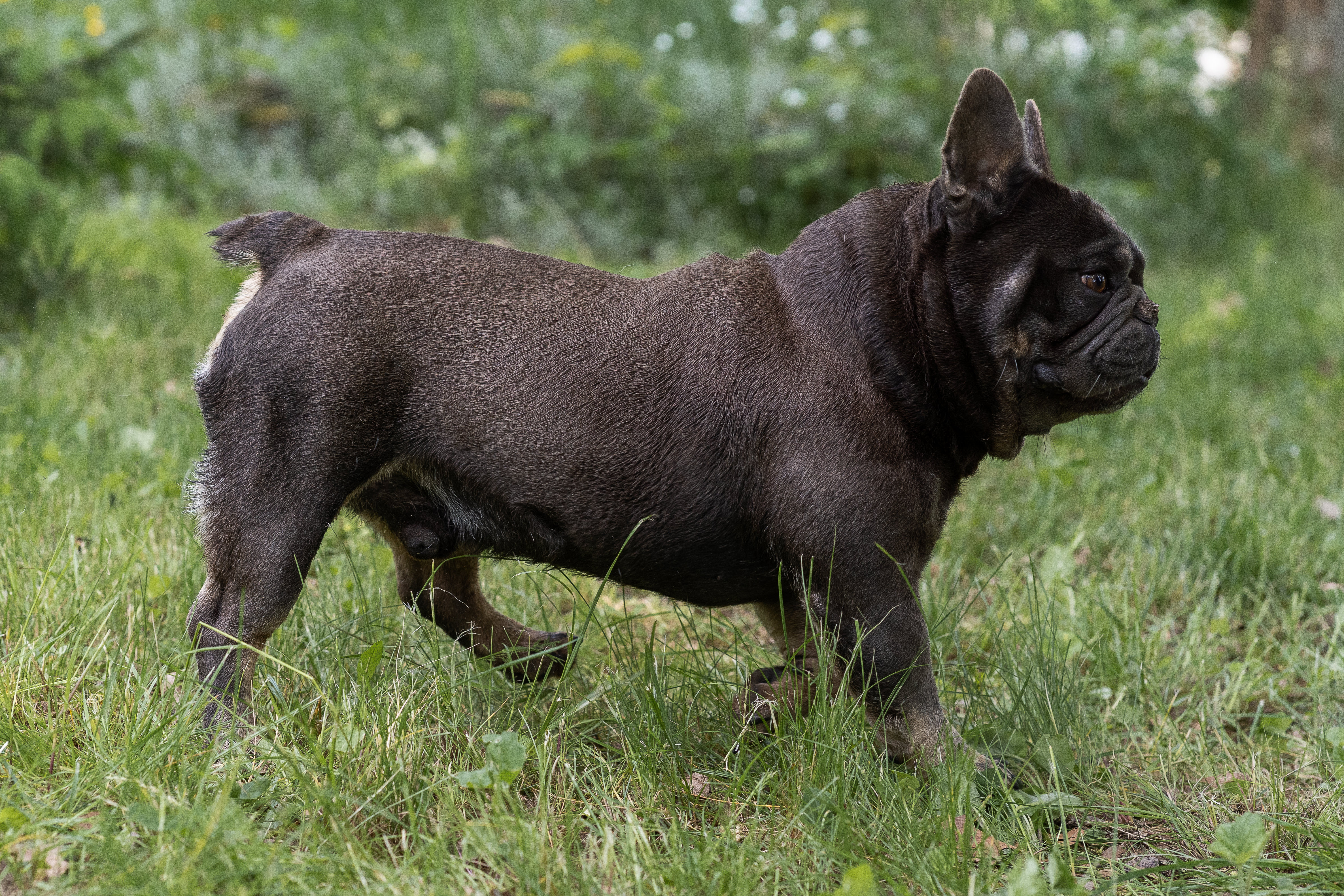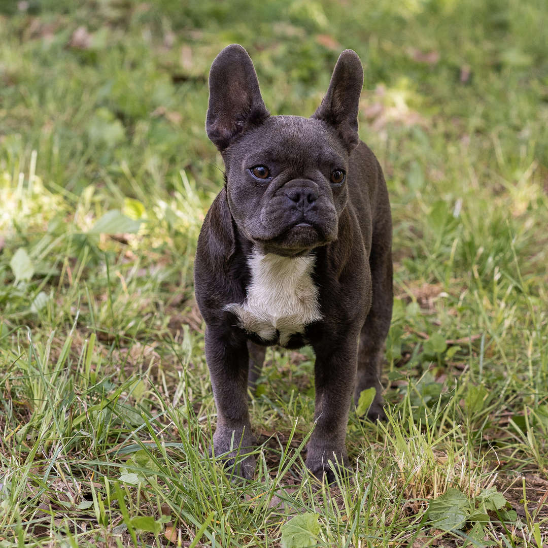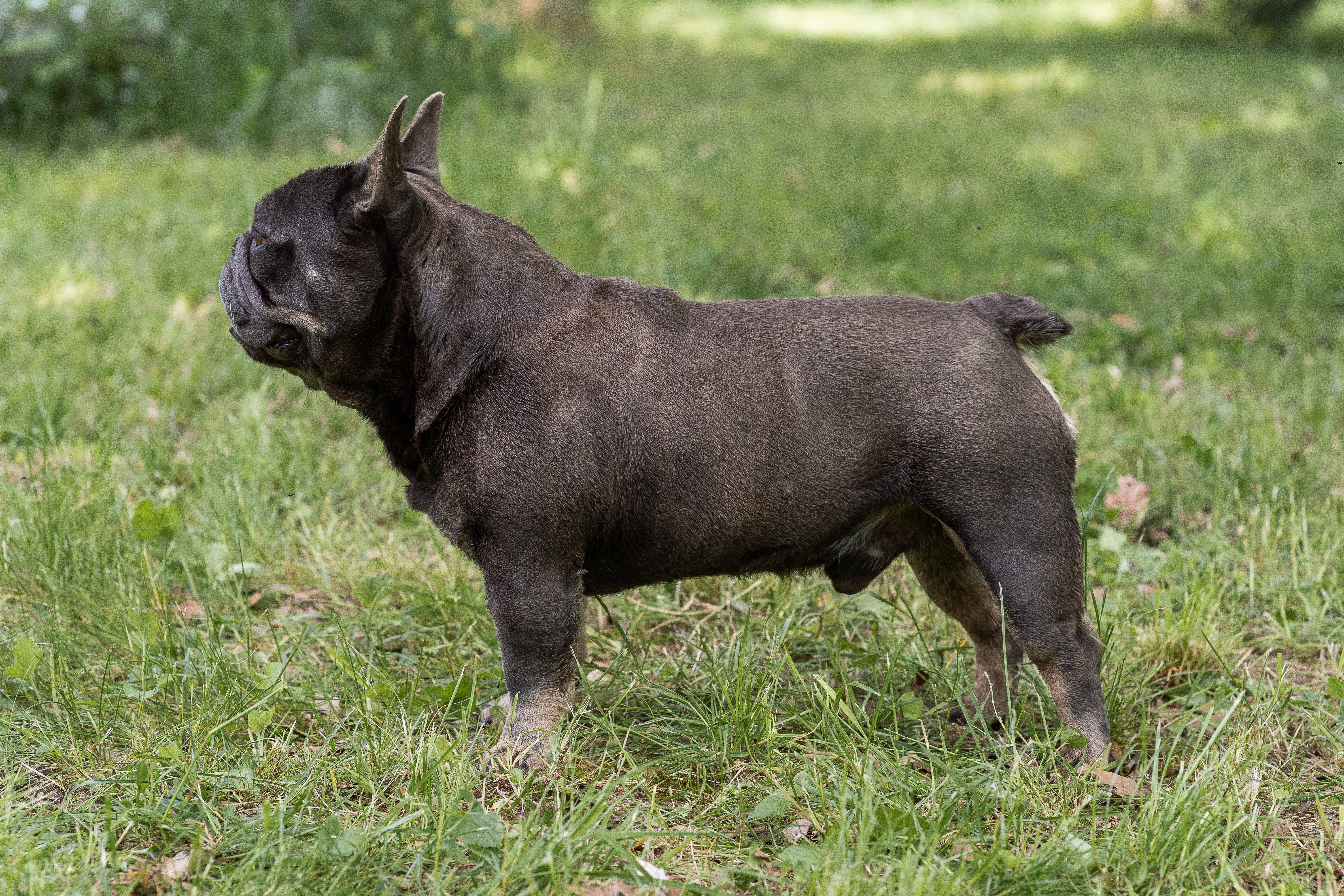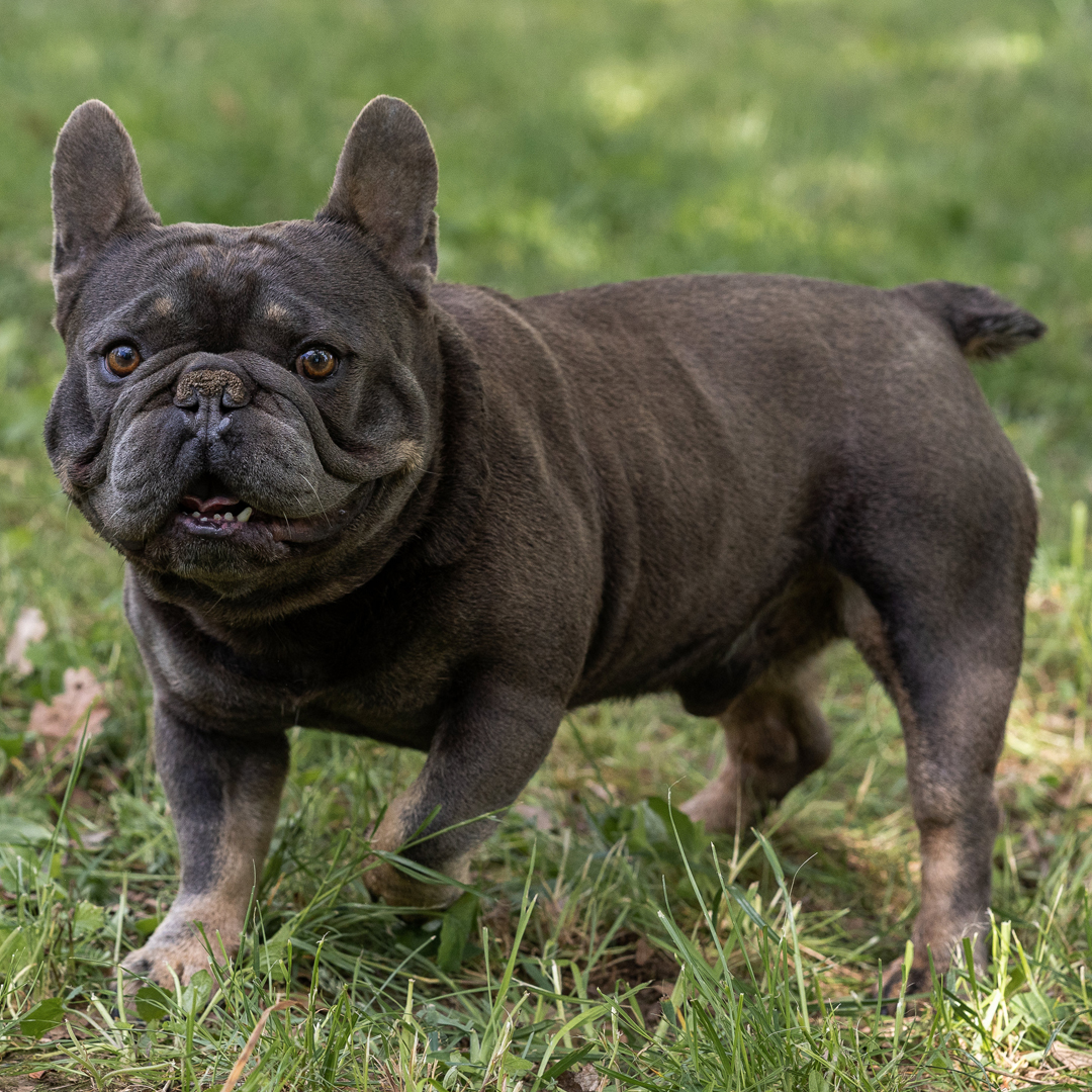 Zömök, standard típusú francia bulldog. Szeret barangolni és csavarogni, okos, kedves, állhatatos, akárcsak a testvére.