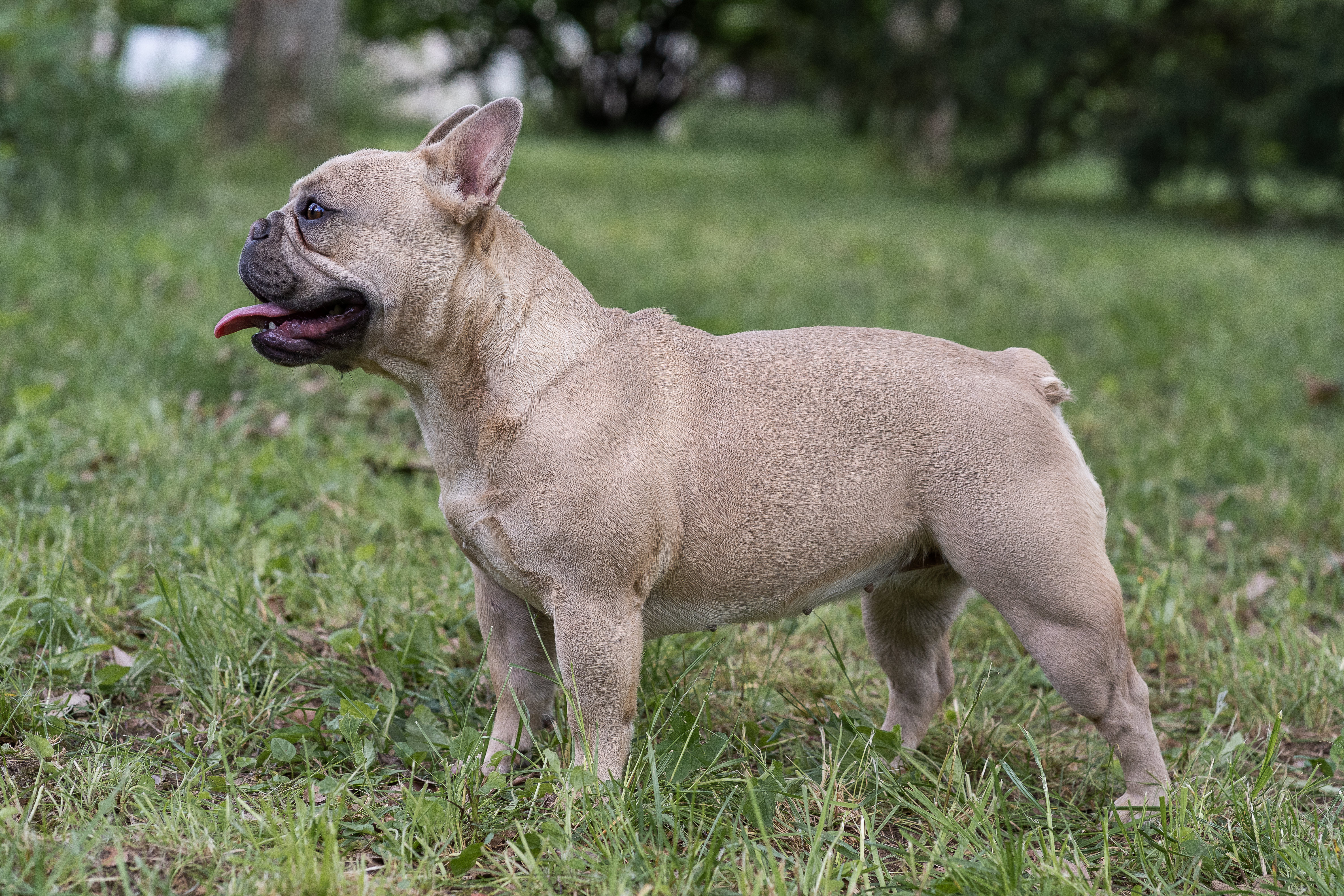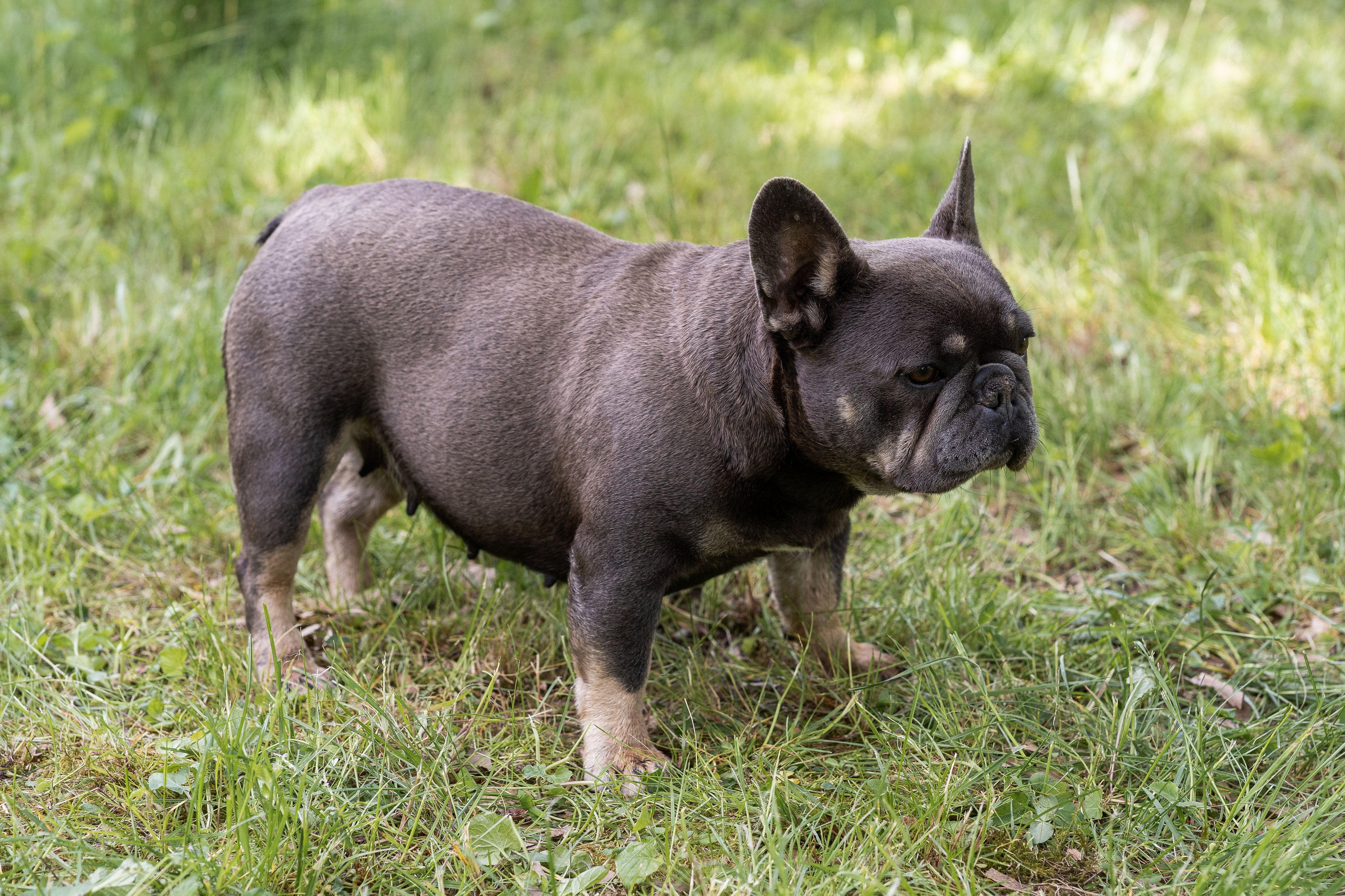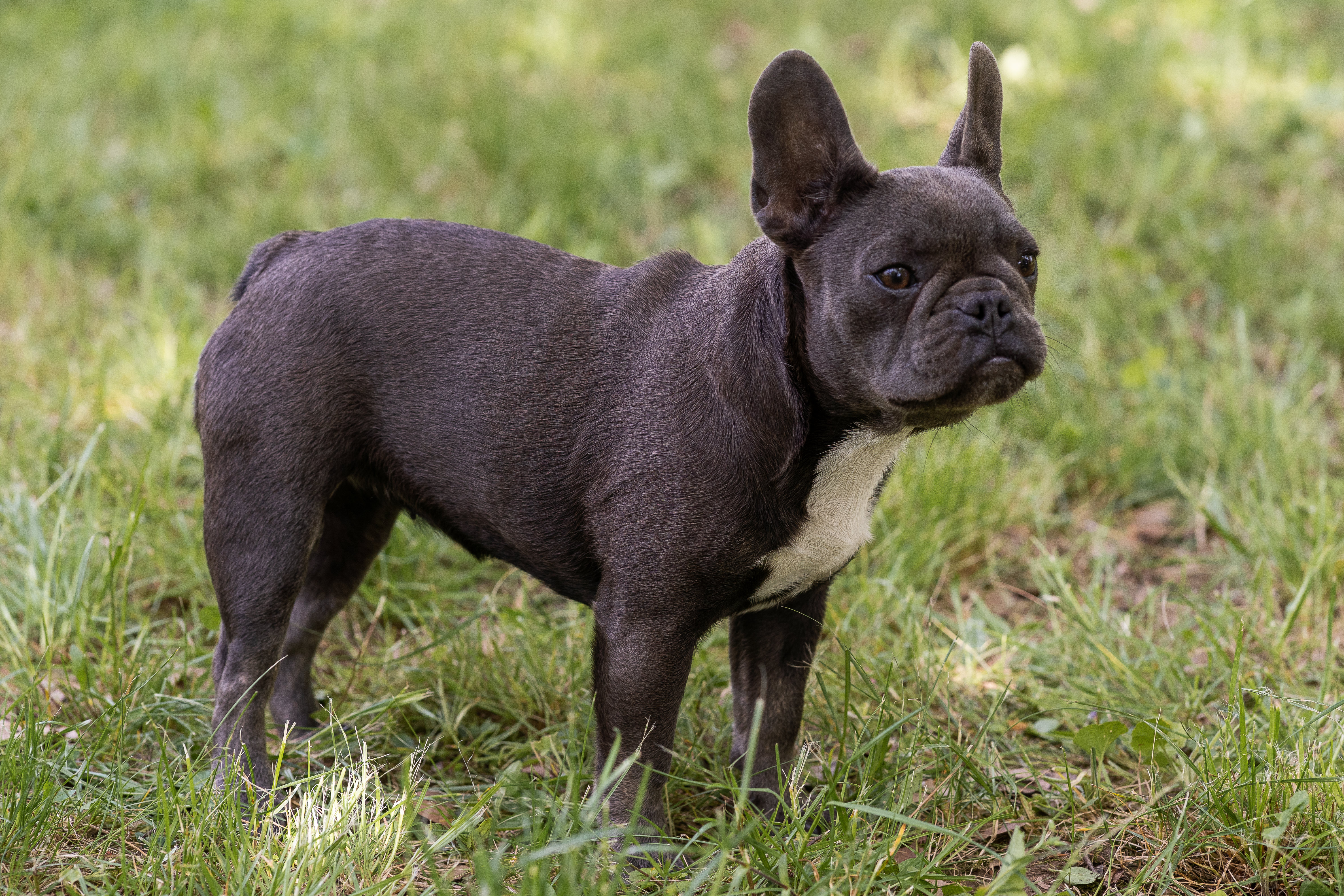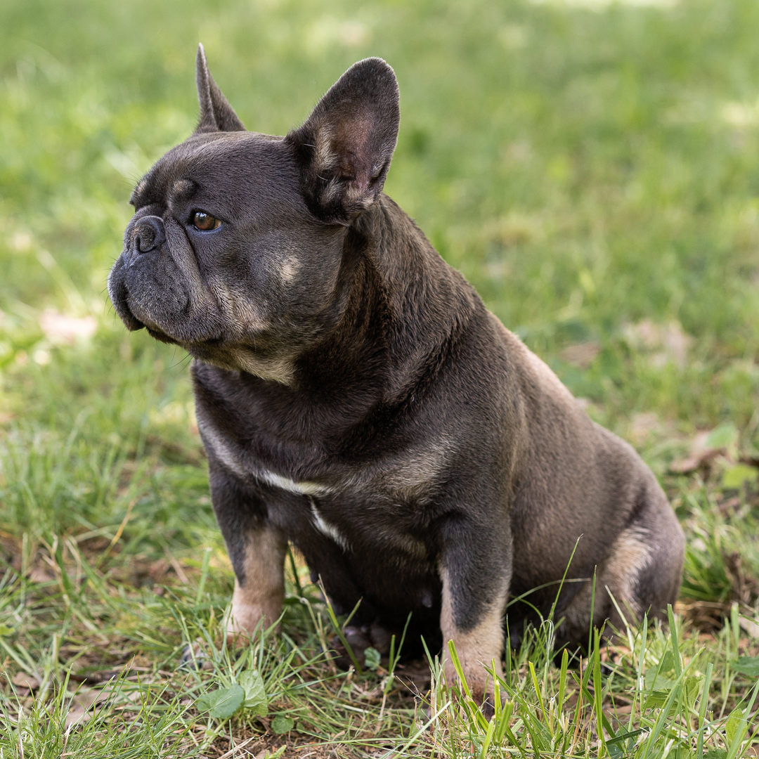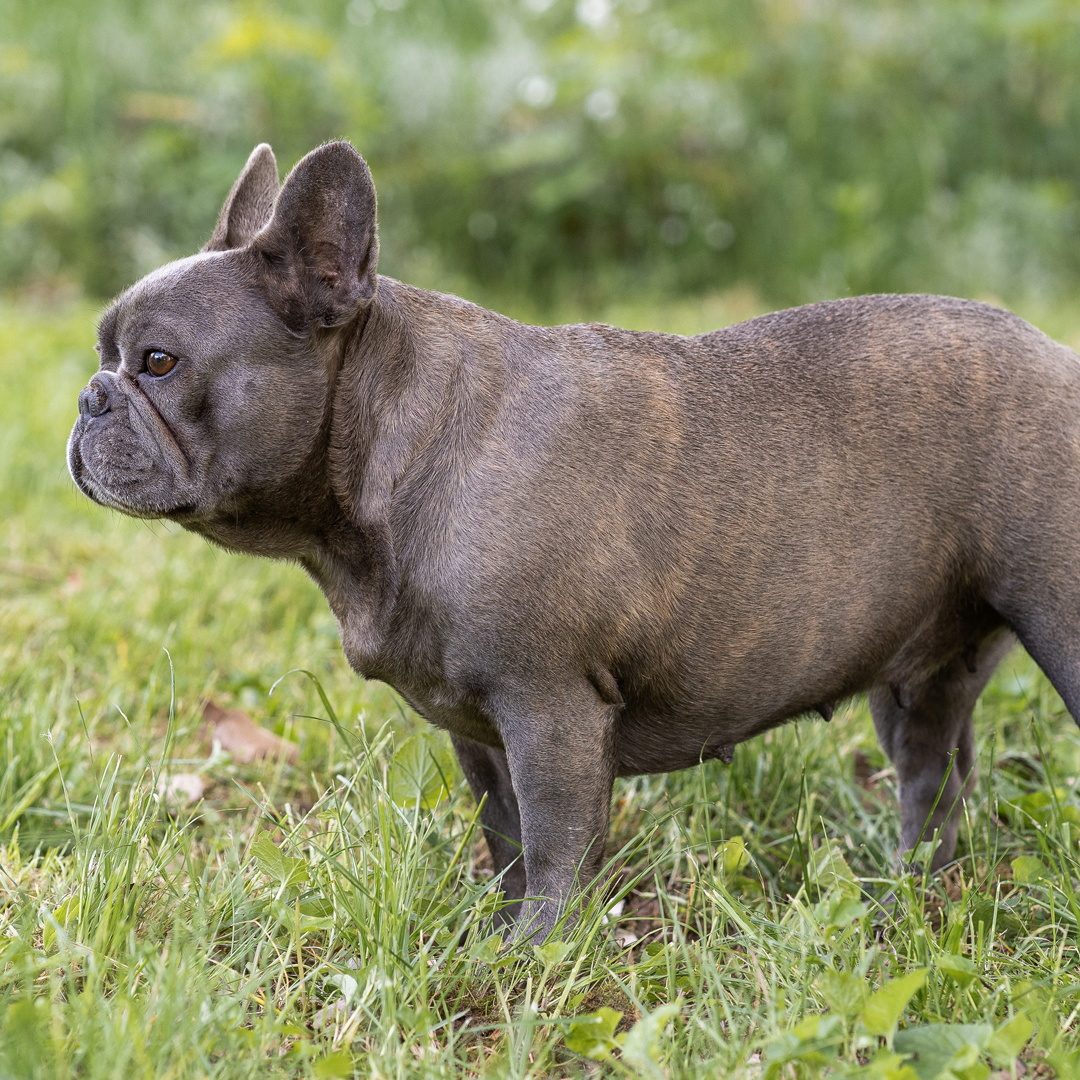Zömök, standard típusú francia bulldog. Szeret barangolni és csavarogni, okos, kedves, állhatatos, akárcsak a testvére.