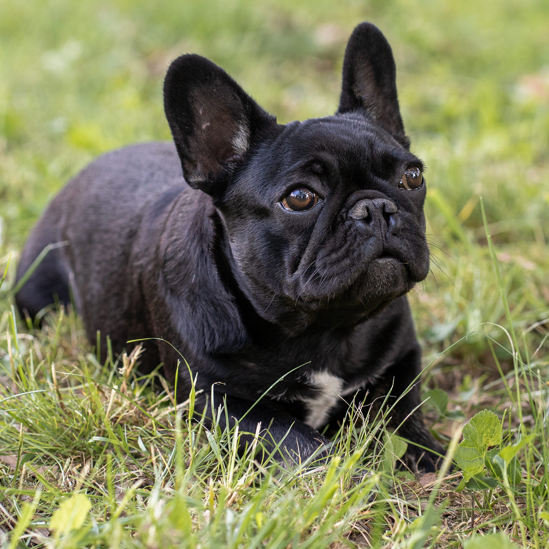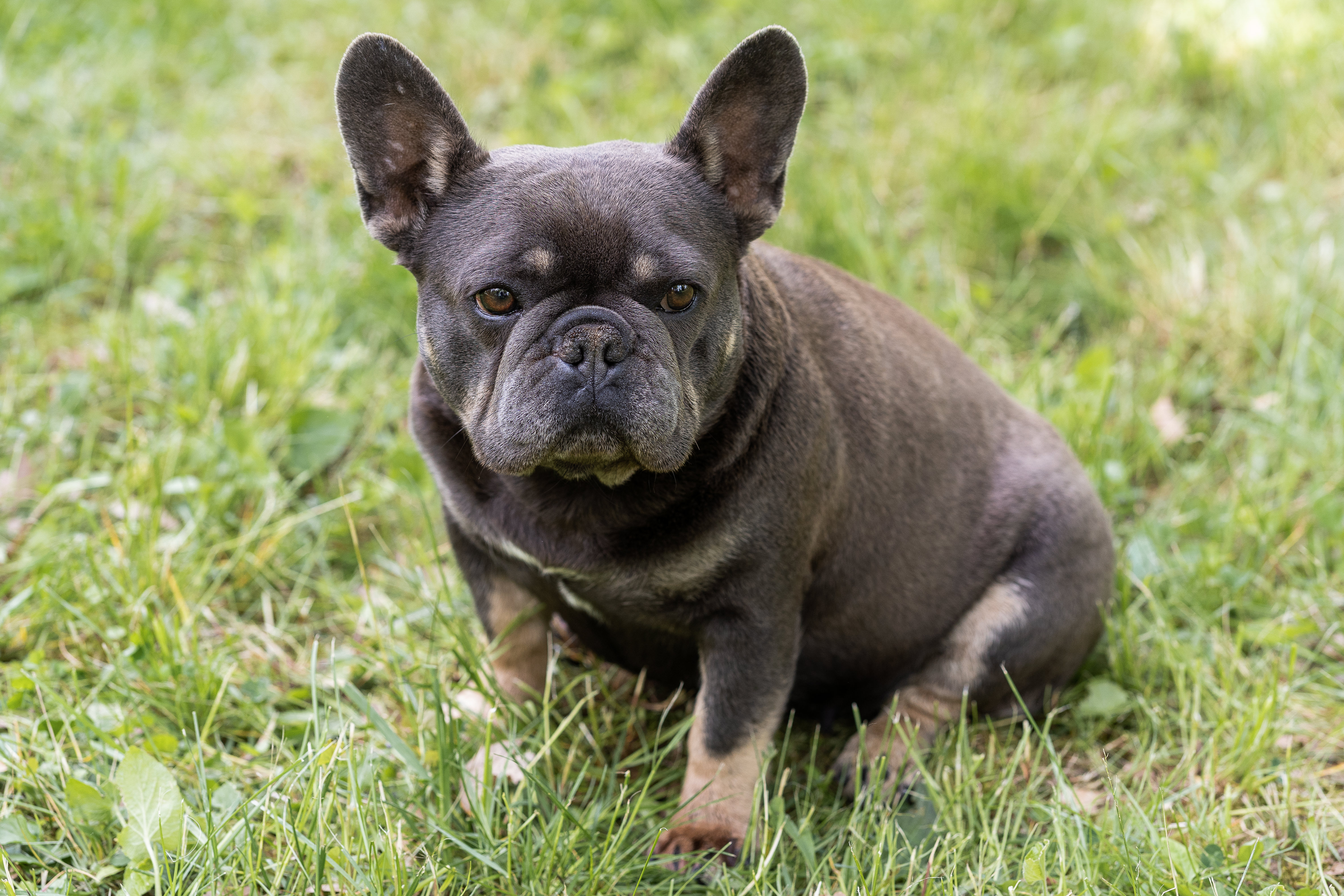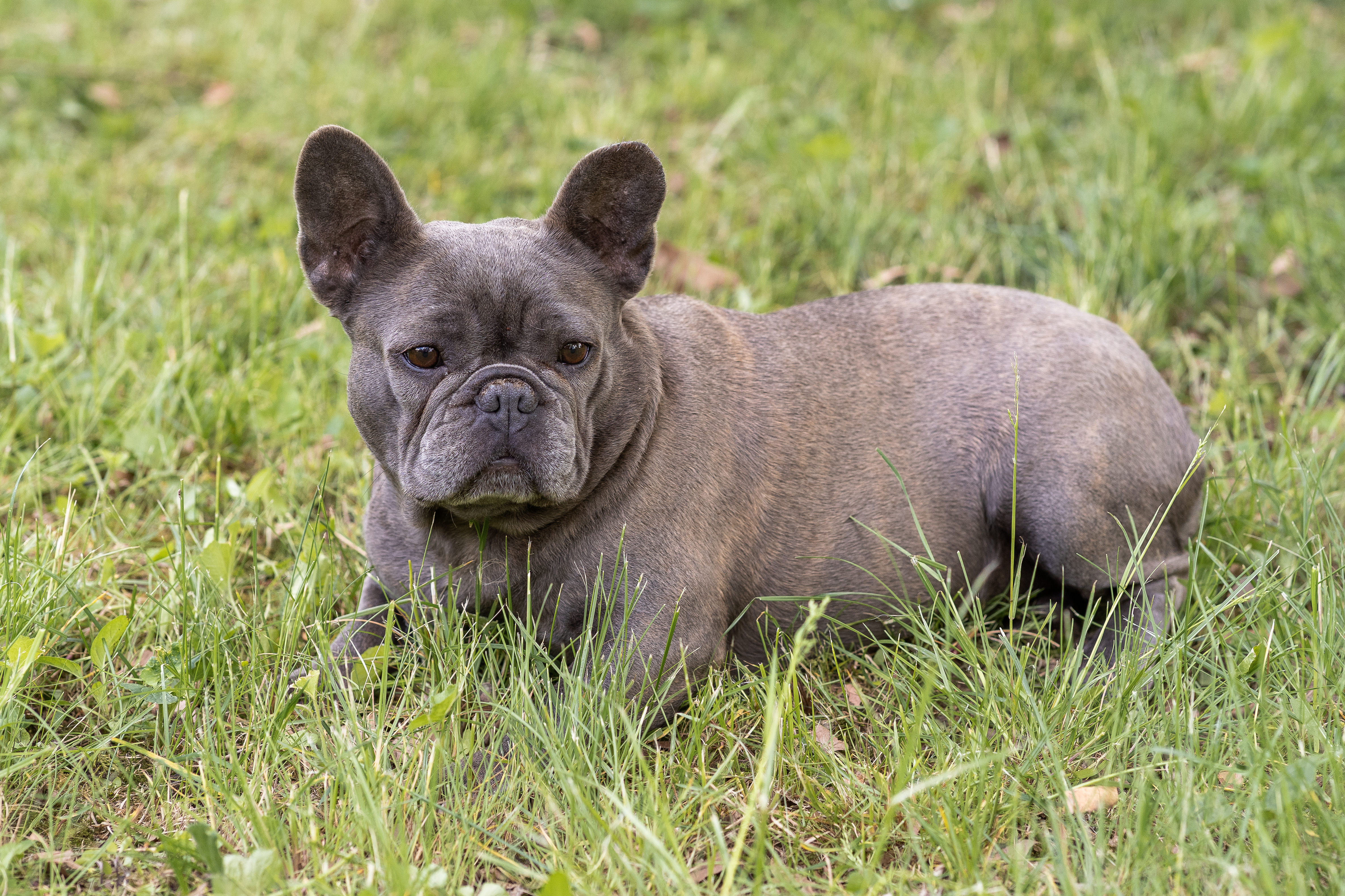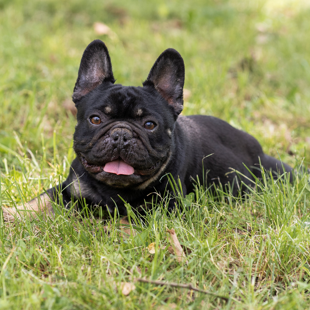 Zömök, standard típusú francia bulldog. Szeret barangolni és csavarogni, okos, kedves, állhatatos, akárcsak a testvére.